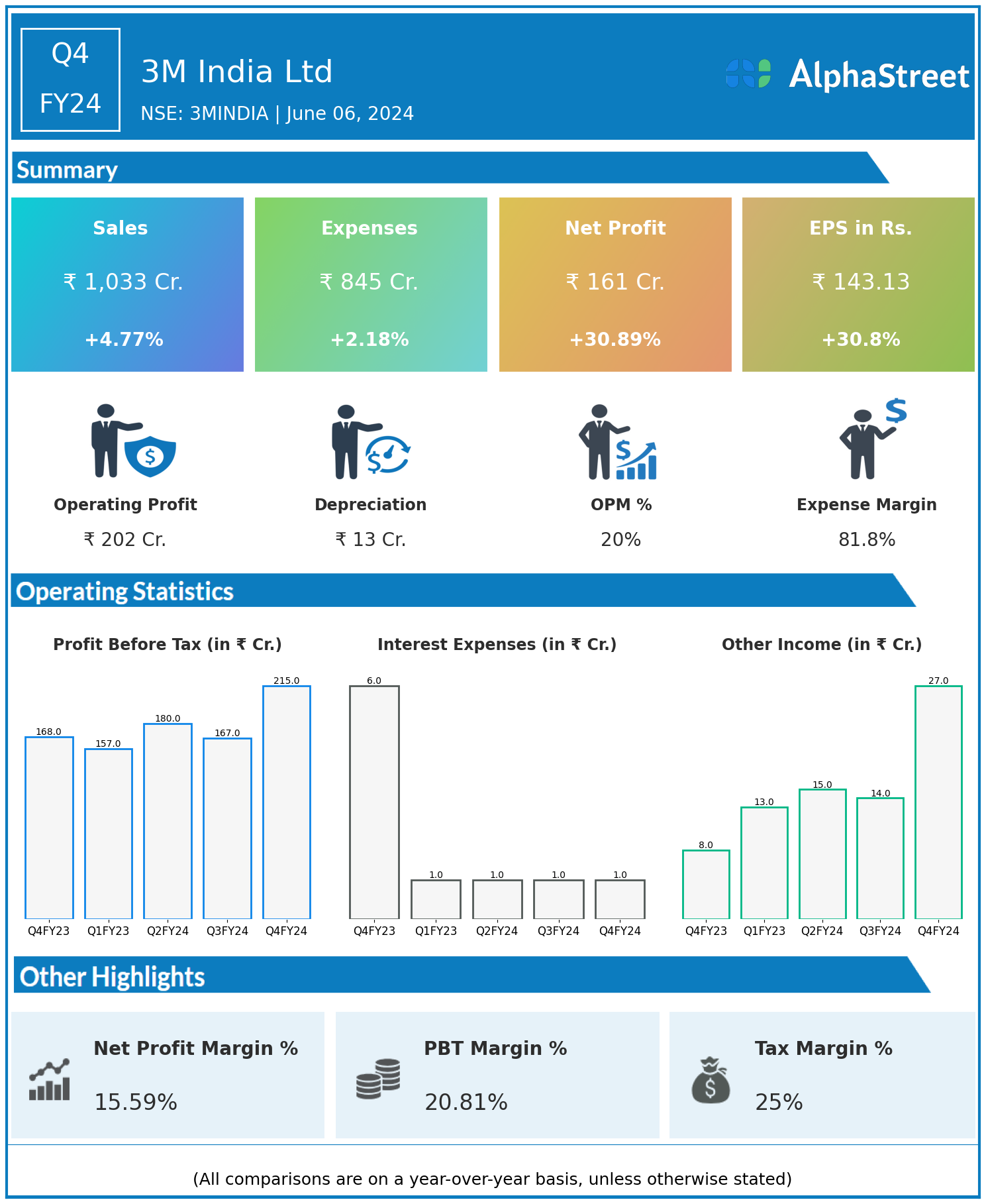3M India Ltd reported Revenues for Q4FY24 of ₹1,033.00 Crores up from ₹986.00 Crore year on year, a rise of 4.77%.
