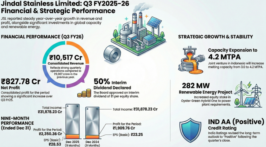 Jindal Stainless Limited (NSE: JSL) reported a consolidated net profit of ₹827.78 crore for the quarter ended December 31, 2025. Current stock price, intraday percentage moves, and specific equity analyst commentary are not contained within the provided sources and should be independently verified. Consolidated revenue from operations for the quarter stood at ₹10,517.55 crore, representing a year-over-year increase from ₹9,907.30 crore.