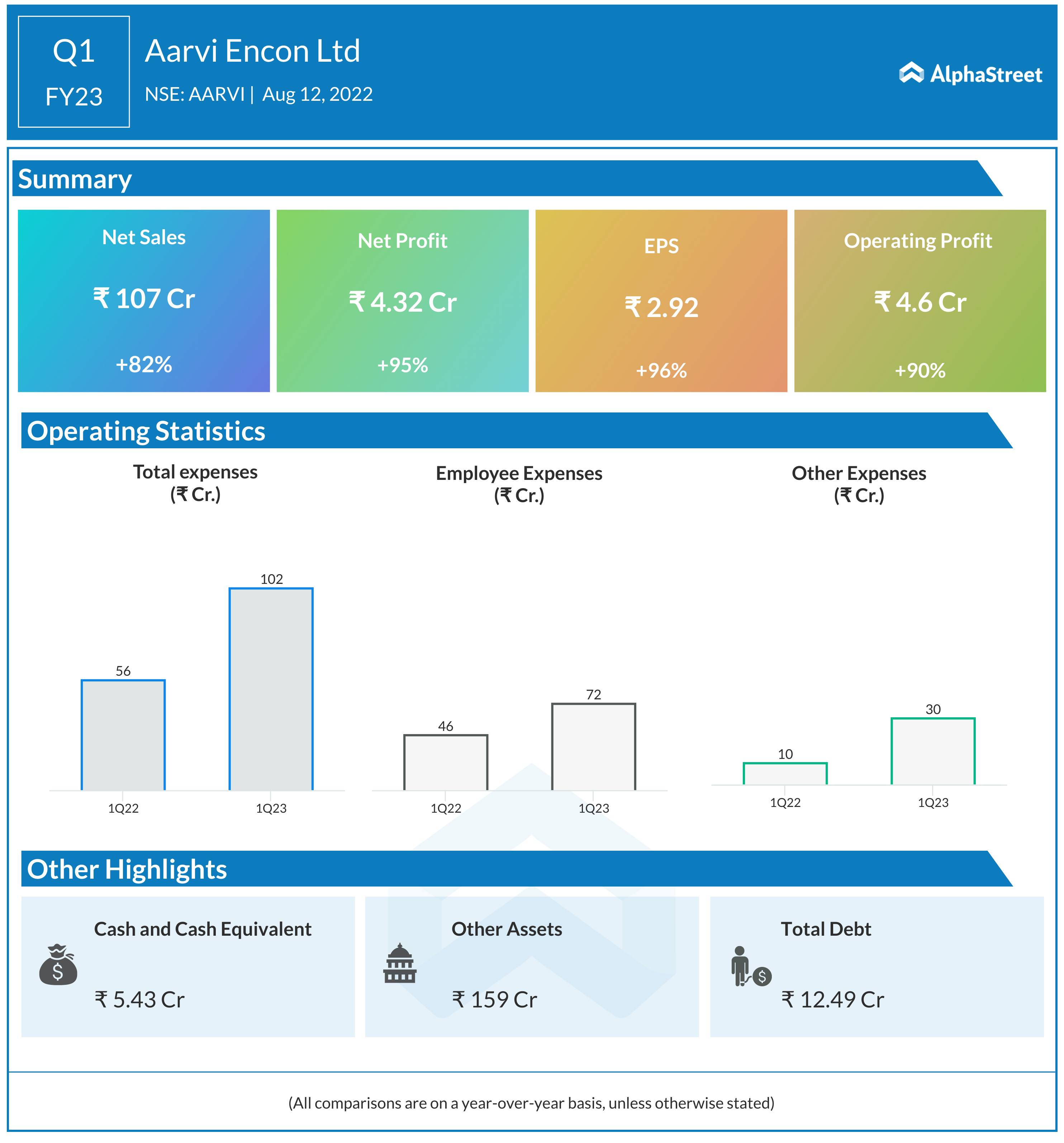 Aarvi Encon declared its financial results for the quarter ended June 2022 wherein the company’s net sales rose by 82% to INR 106.64 Crores while the net profit rose by 95% to a whopping INR 4.32 Crores. With such rise in the topline of the company, the expenses too have risen proportionately as a result of which the operating profit of the company stands at INR 4.6 Crores. Though this a phenomenal growth of 90%. The company registered an EPS of INR 2.92 which is yet again an increase of 96%