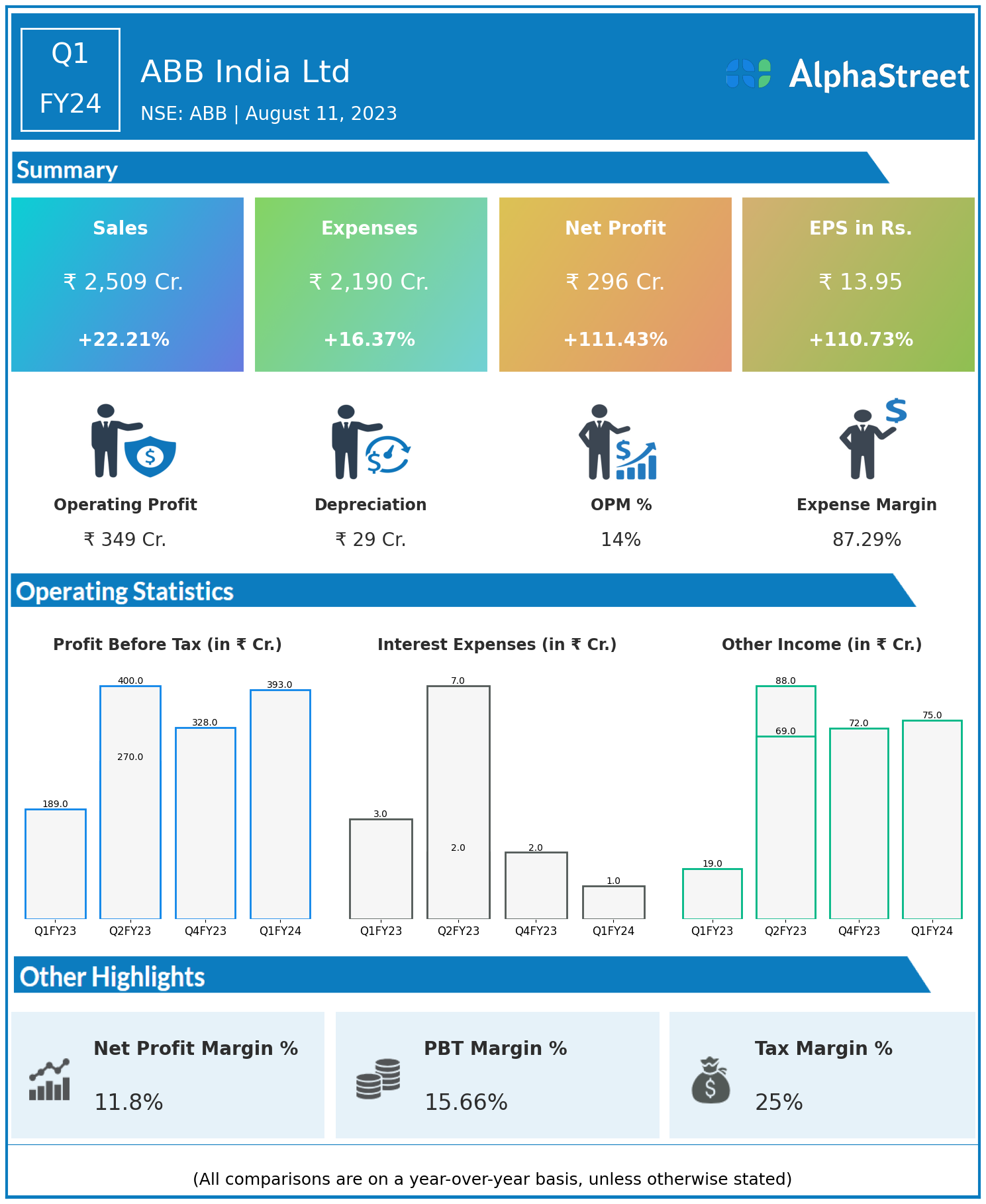 ABB India Ltd reported Revenues for Q1FY24 of ₹2,509.00 Crores up from ₹2,053.00 Crore year on year, a rise of 22.21%.