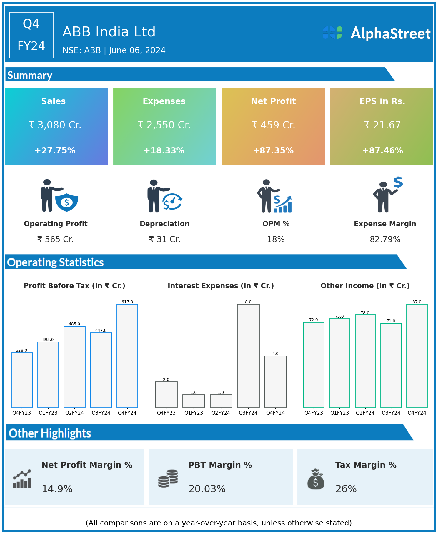 ABB India Ltd reported Revenues for Q4FY24 of ₹3,080.00 Crores up from ₹2,411.00 Crore year on year, a rise of 27.75%.