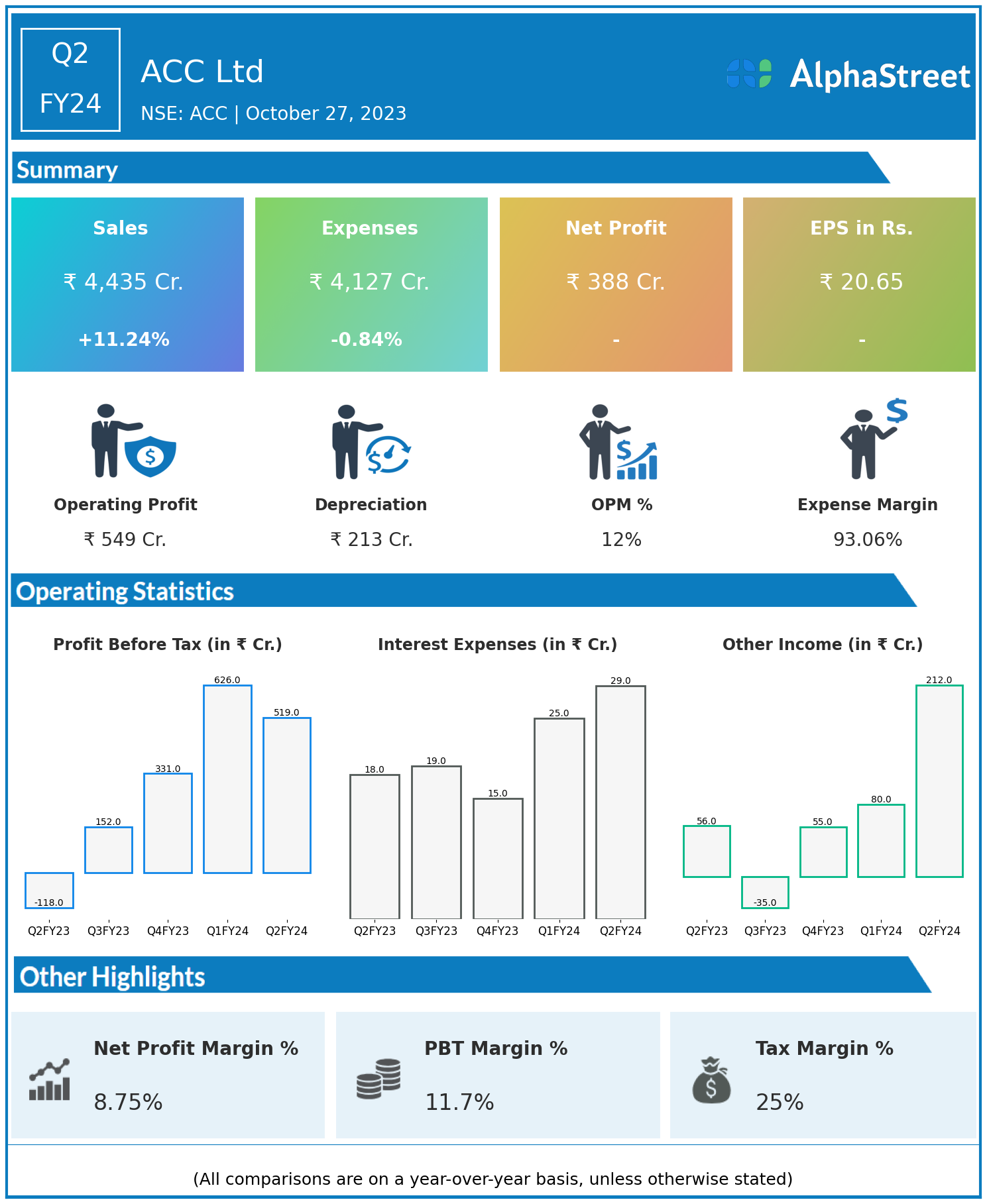 ACC Ltd reported Revenues for Q2FY24 of ₹4,435.00 Crores up from ₹3,987.00 Crore year on year, a rise of 11.24%.