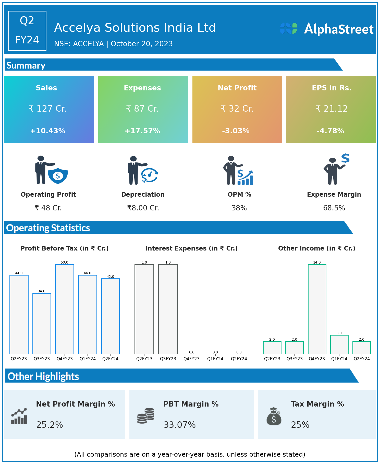 Accelya Solutions India Ltd reported Revenues for Q2FY24 of ₹127.00 Crores up from ₹115.00 Crore year on year, a rise of 10.43%.