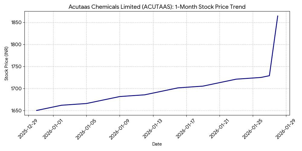 Shares of Acutaas Chemicals Ltd (NSE: ACUTAAS, BSE: 543349) ended Wednesday’s trading session at ₹1,864.45, an intraday increase of 7.84%. The stock opened at ₹1,748.00 and reached a high of ₹1,893.90 on the National Stock Exchange. Trading volume stood at 1,239,184 shares, significantly exceeding the 30-day average.