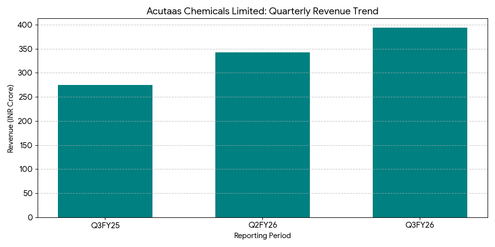 Acutaas Chemicals reported consolidated revenue from operations of ₹393.18 crore for the quarter ended December 31, 2025, a year-over-year increase of 42.98% from ₹275.00 crore. Consolidated net profit for the quarter rose to ₹107.96 crore, a 140.18% increase from ₹44.95 crore in the year-ago period.