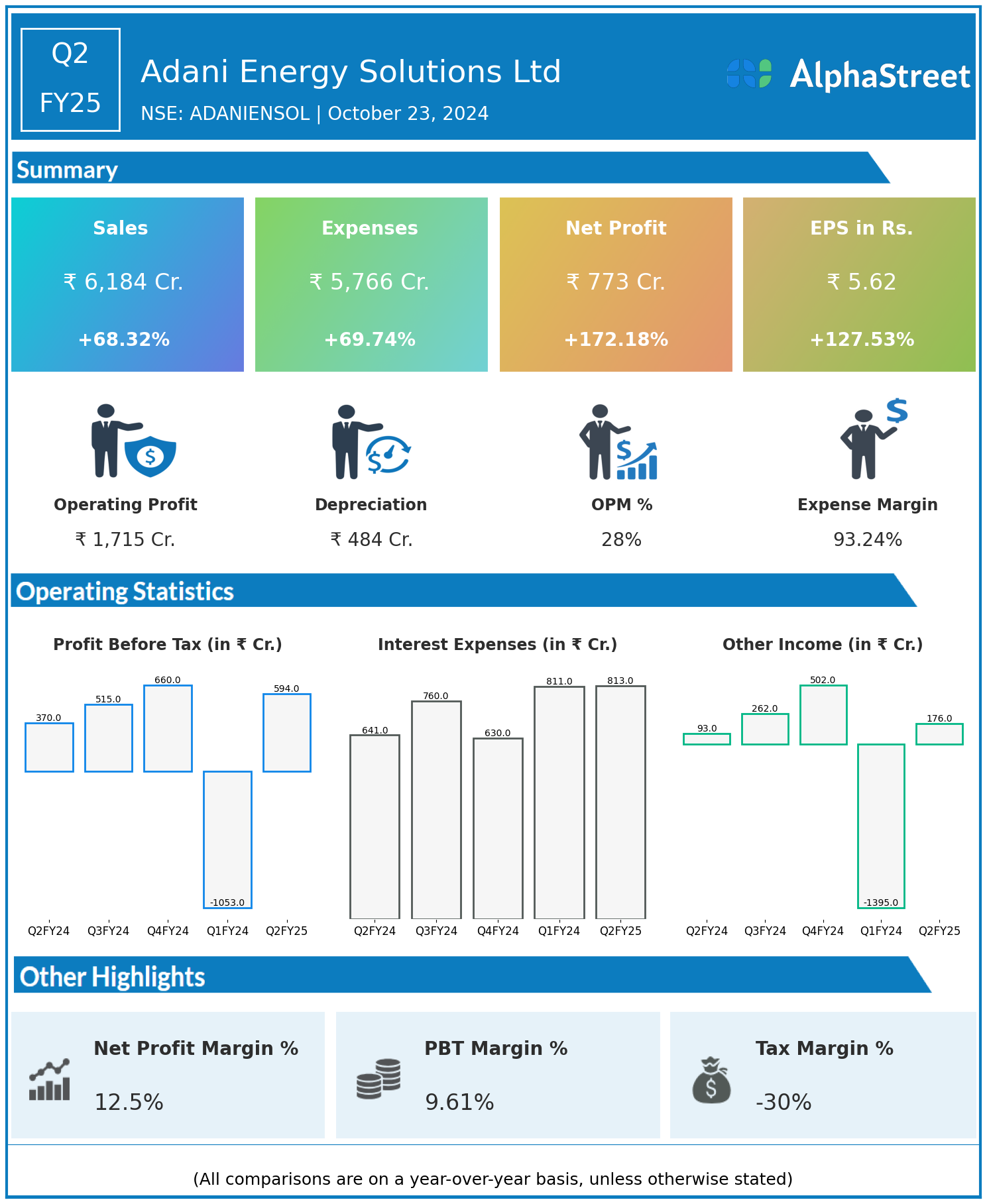 Adani Energy Solutions Ltd reported Revenues for Q2FY25 of ₹6,184.00 Crores up from ₹3,674.00 Crore year on year, a rise of 68.32%.
