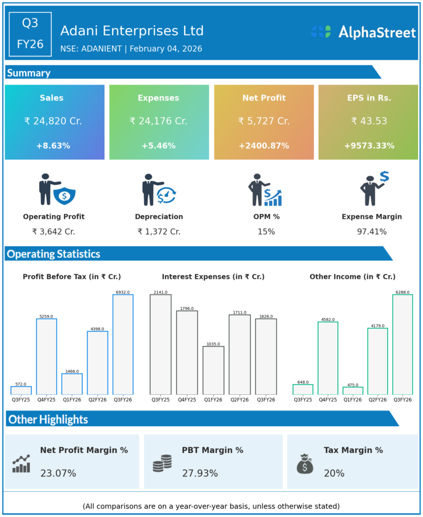 Adani Enterprises Ltd reported Q3FY26 revenues of ₹24,820 crore, up 8.63% YoY, with consolidated net profit exploding 2400.87% to ₹5,727 crore primarily from one-time exceptional gains. Strategic asset monetization across airports, new energy, and integrated resources drove the dramatic profitability leap despite modest operational growth.