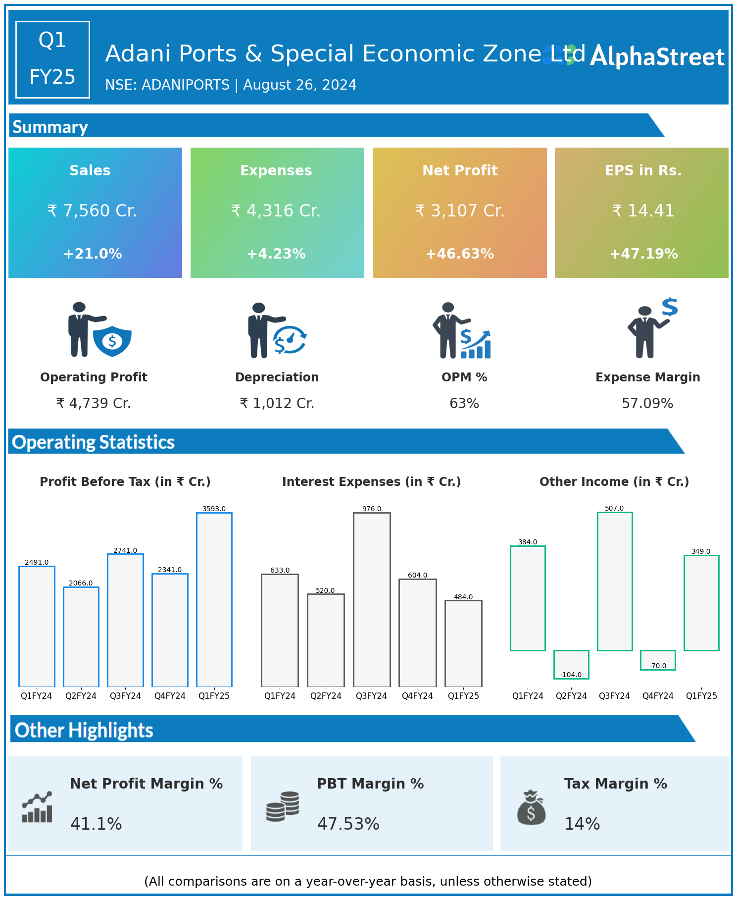 Adani Ports & Special Economic Zone Ltd reported Revenues for Q1FY25 of ₹7,560.00 Crores up from ₹6,248.00 Crore year on year, a rise of 21.0%.