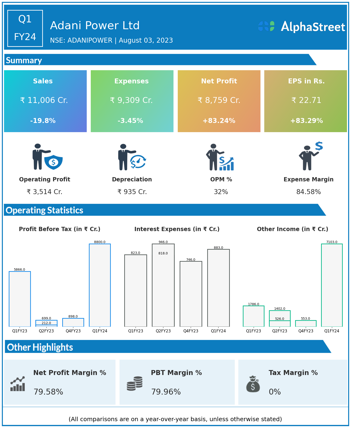 Adani Power Ltd reported Revenues for Q1FY24 of ₹11,006.00 Crores down from ₹13,723.00 Crore year on year, a fall of 19.8%.