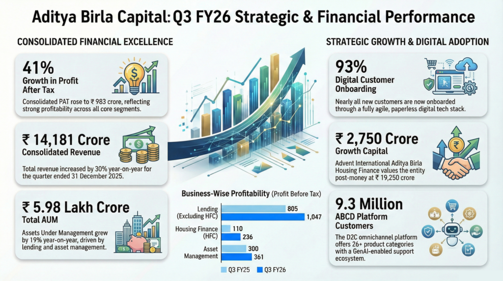 Aditya Birla Capital Limited achieved a 30% year-over-year increase in consolidated revenue for the period ending December 31, 2025. The company’s consolidated profit after tax grew by 41% compared to the third quarter of the previous fiscal year, excluding exceptional labor code impacts. Growth was driven by momentum across the lending, asset management, and insurance businesses. Standalone return on equity reached 15.2% during this quarter.