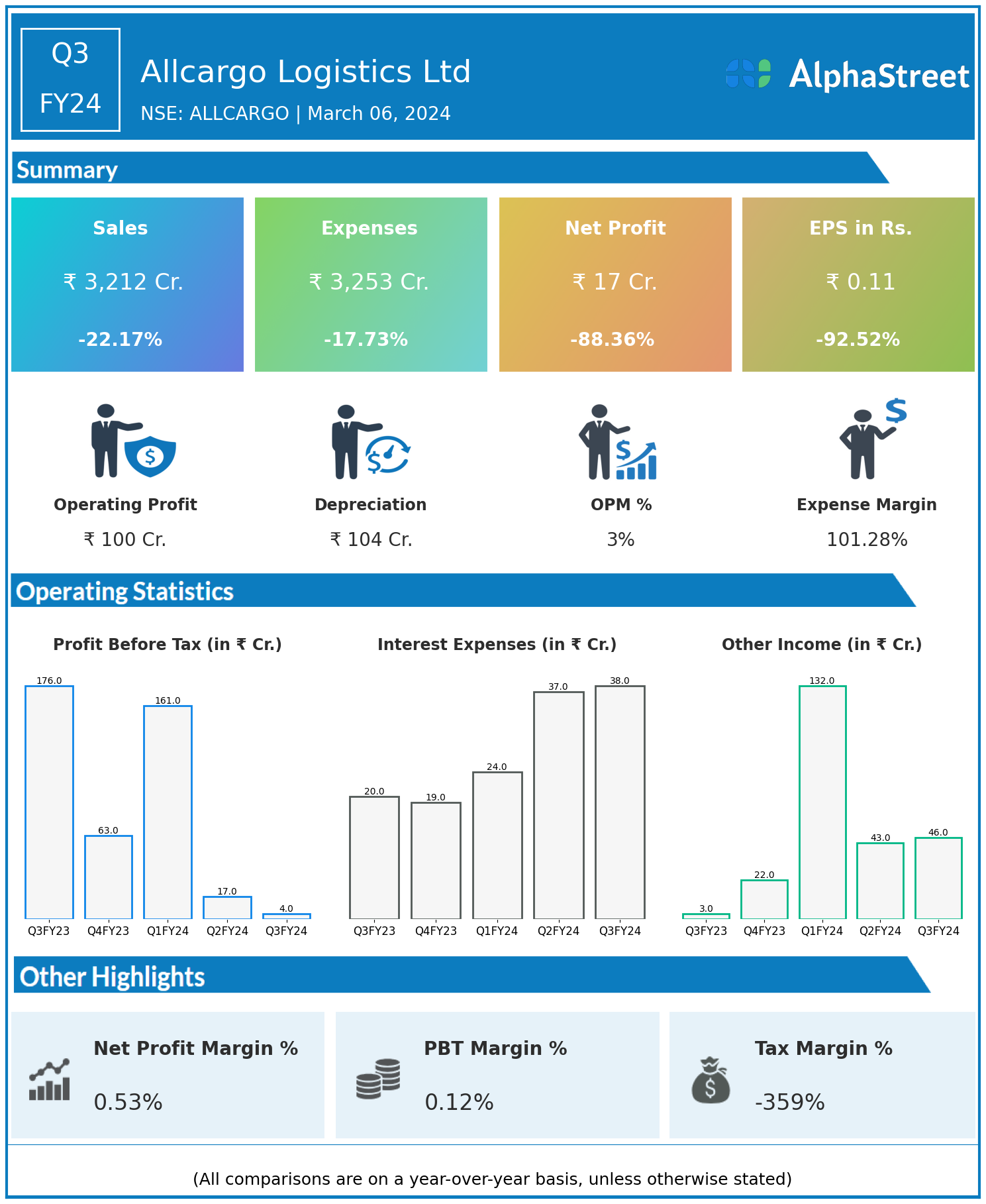 Allcargo Logistics Ltd reported Revenues for Q3FY24 of ₹3,212.00 Crores down from ₹4,127.00 Crore year on year, a fall of 22.17%.