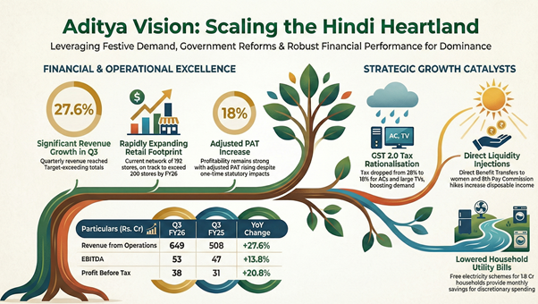 Strong execution during the festive season and post-GST reform tailwinds propelled Aditya Vision Limited to a robust third-quarter performance. The consumer electronics retailer reported double-digit growth in top-line revenue and maintained steady expansion across its core Hindi heartland markets.