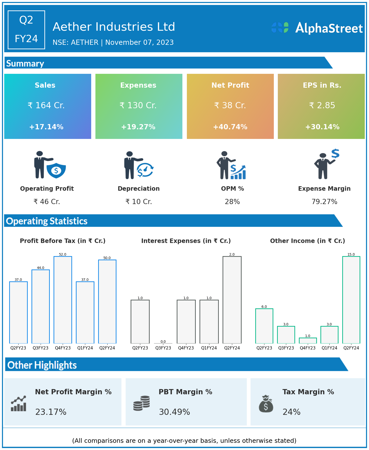 Aether Industries Ltd reported Revenues for Q2FY24 of ₹164.00 Crores up from ₹140.00 Crore year on year, a rise of 17.14%.