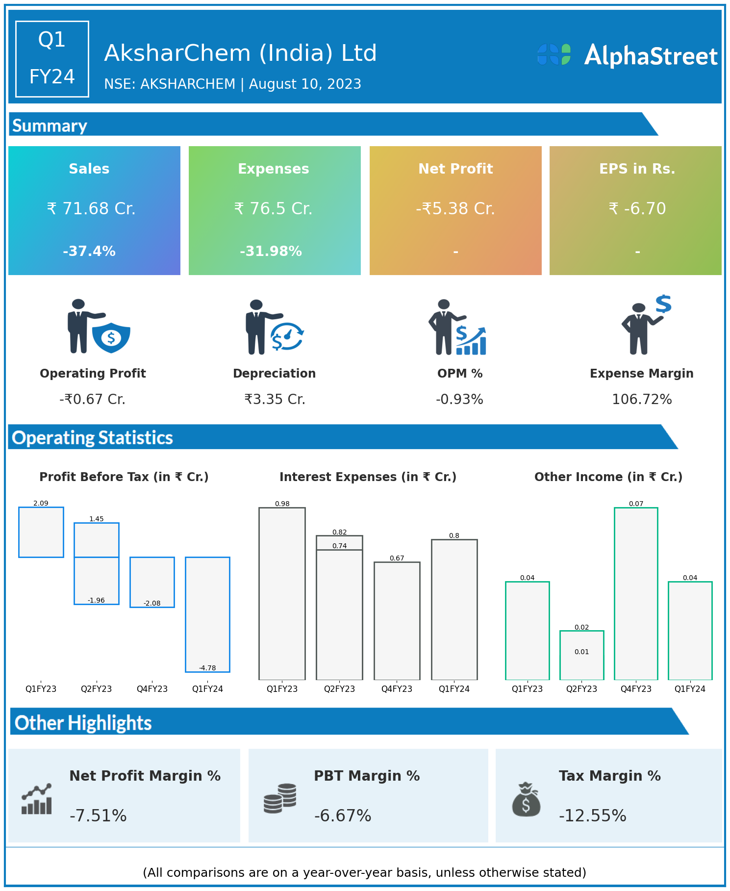 AksharChem (India) Ltd reported Revenues for Q1FY24 of ₹71.68 Crores down from ₹114.51 Crore year on year, a fall of 37.4%.