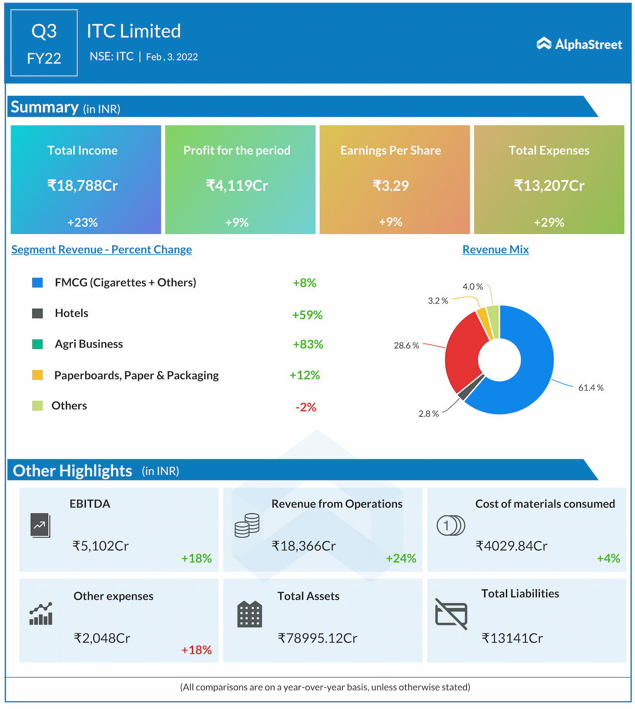 ITC (NSE: ITC) reported its third-quarter earnings results after market hours today.