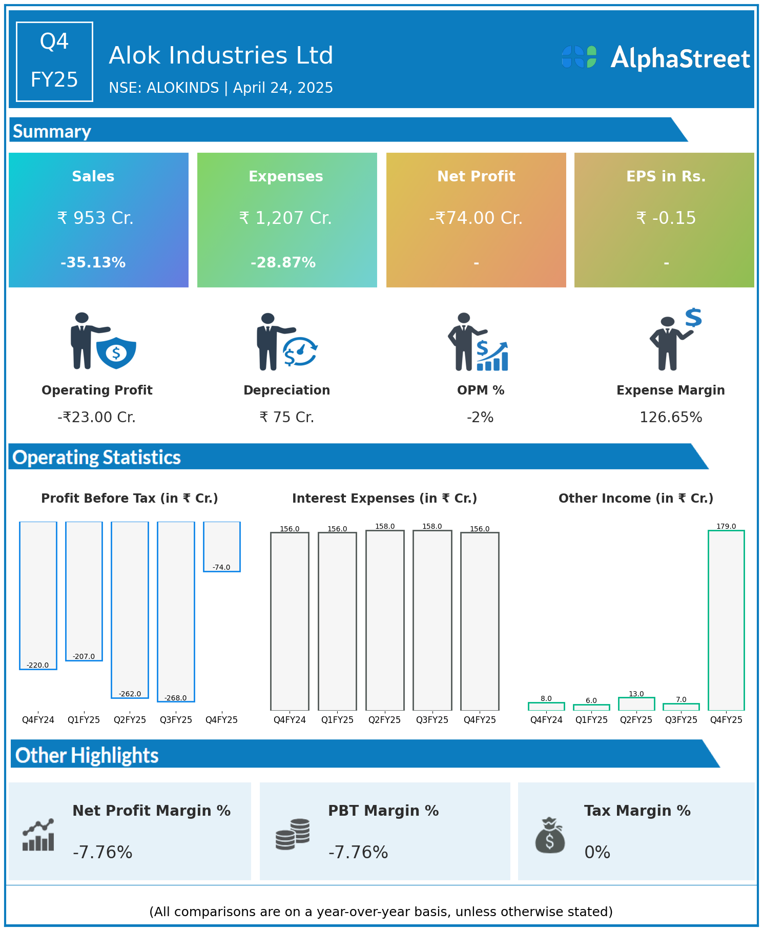 Alok Industries Ltd reported Revenues for Q4FY25 of ₹953.00 Crores down from ₹1,469.00 Crore year on year, a fall of 35.13%.