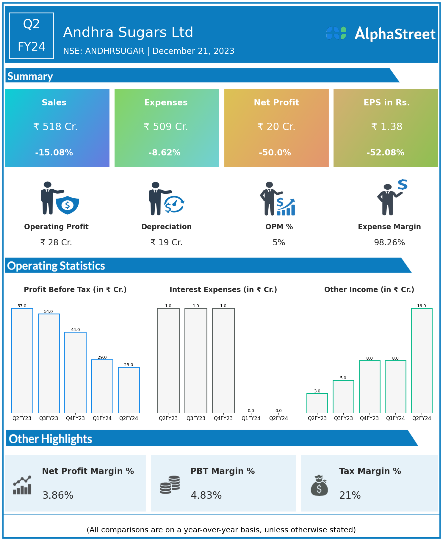 Andhra Sugars Ltd reported Revenues for Q2FY24 of ₹518.00 Crores down from ₹610.00 Crore year on year, a fall of 15.08%.