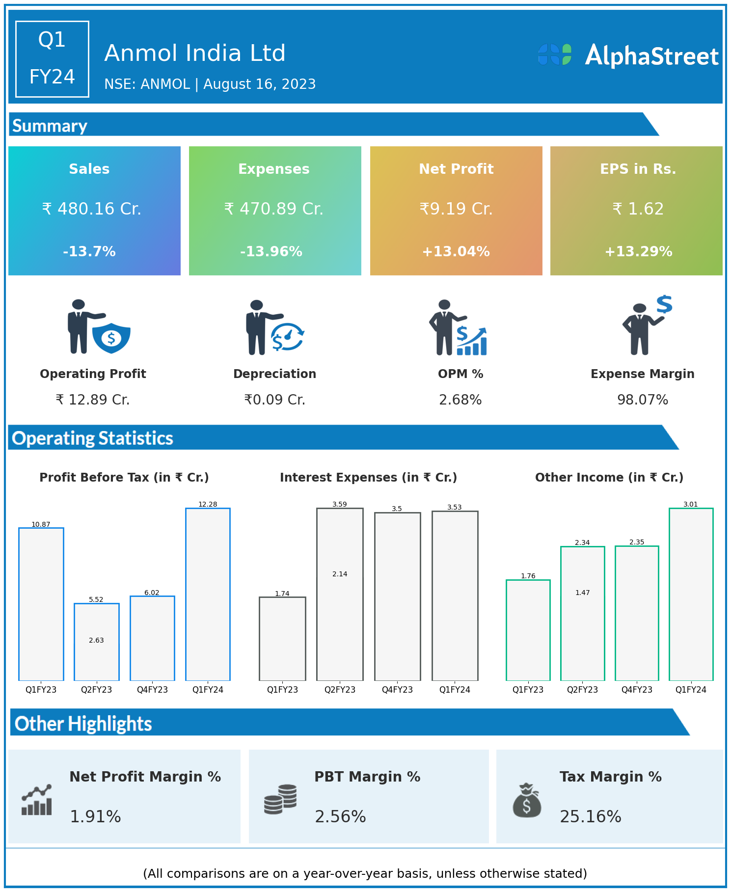 Anmol India Ltd reported Revenues for Q1FY24 of ₹480.16 Crores down from ₹556.38 Crore year on year, a fall of 13.7%.