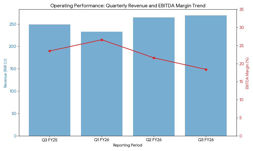 EBITDA for the quarter was ₹49.6 crore, down 15% from ₹58.5 crore in the year-ago period. The EBITDA margin compressed to 18.4% from 23.5% year-over-year. Management attributed the margin pressure primarily to higher employee costs following annual appraisals and incremental manpower additions.