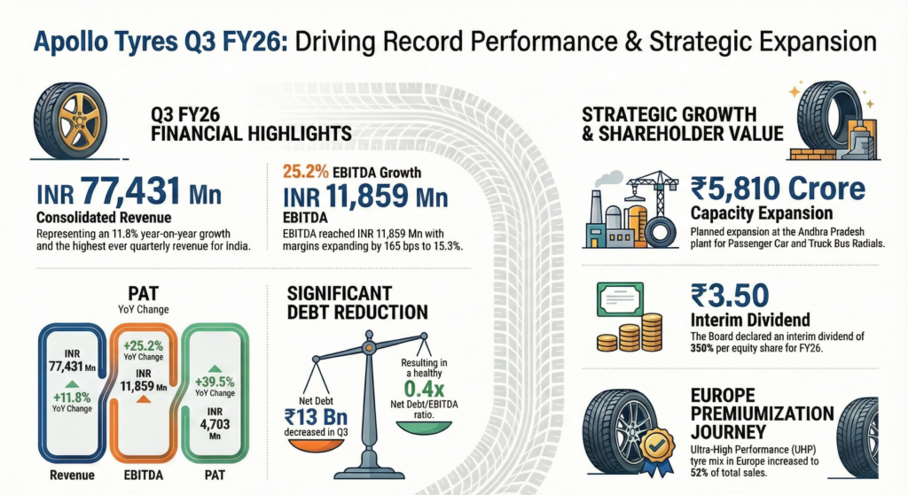 Apollo Tyres Ltd (NSE: APOLLOTYRE) reported consolidated revenue of ₹77,431 million for the quarter ended December 31, 2025, a 11.8% increase year-over-year. This growth was driven by pent-up demand in India following GST rate reductions and robust double-digit growth across replacement, OE, and export channels. Consolidated EBITDA rose 25.2% to ₹11,859 million, with margins expanding 165 basis points to 15.3%. Net debt decreased by ₹13 billion during the quarter to reach ₹13 billion by December 2025.