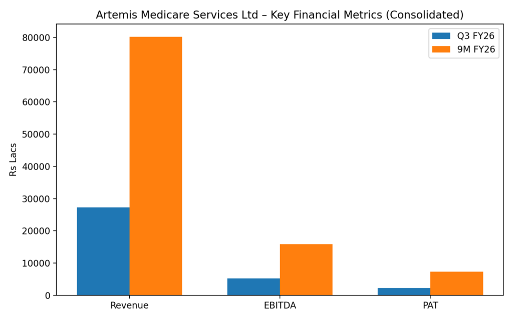 Artemis Medicare Services Ltd (NSE:ARTEMISMED), a leading healthcare provider operating 800+ beds, anchored by a quaternary care, super-specialty hospital, reported a rise in third-quarter and nine-month earnings on the back of higher patient volumes, improved pricing and a sharp increase in overseas patient revenue. The company focuses on high-acuity treatments, medical value travel and selective capacity expansion across India.