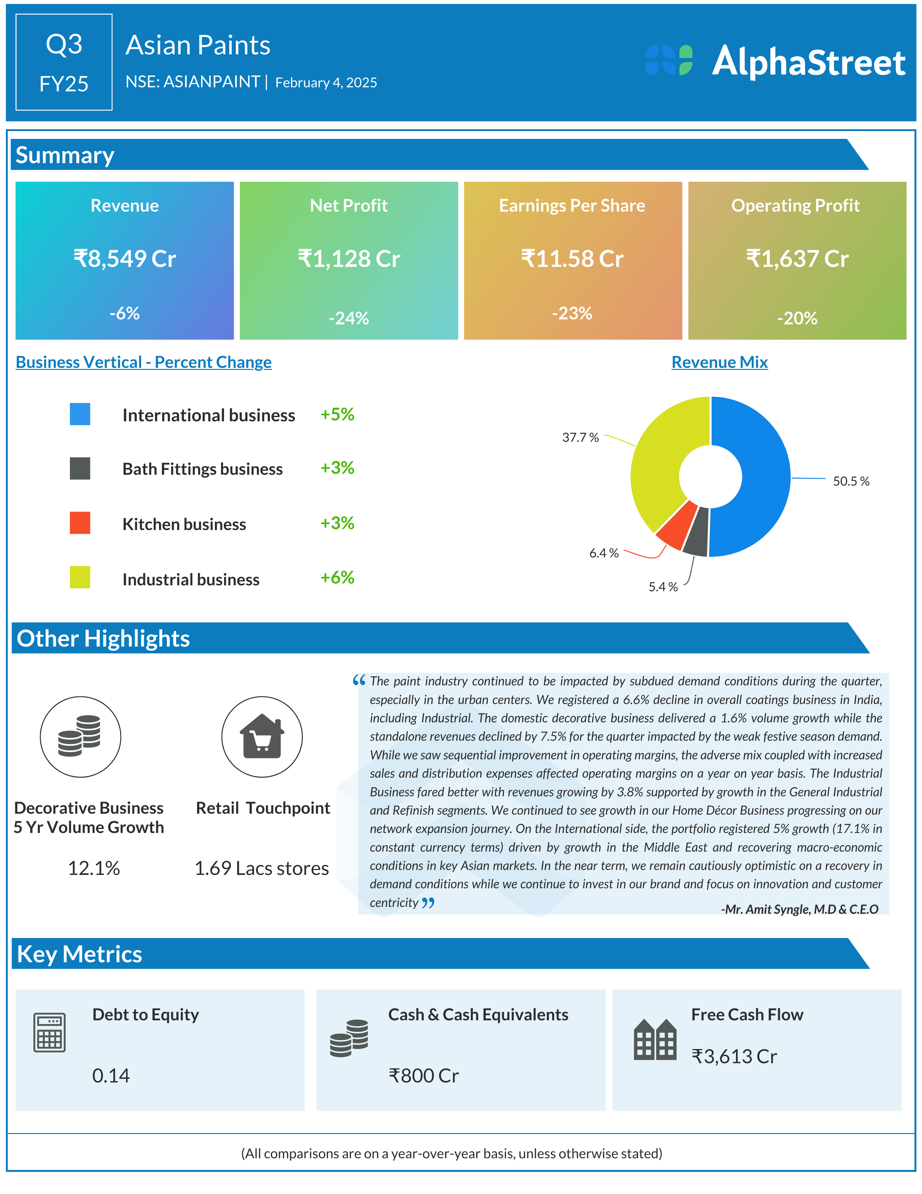 Asian Paints Ltd reported Revenues for Q3FY25 of ₹8,549.00 Crores down from ₹9,103.00 Crore year on year, a fall of 6.09%.