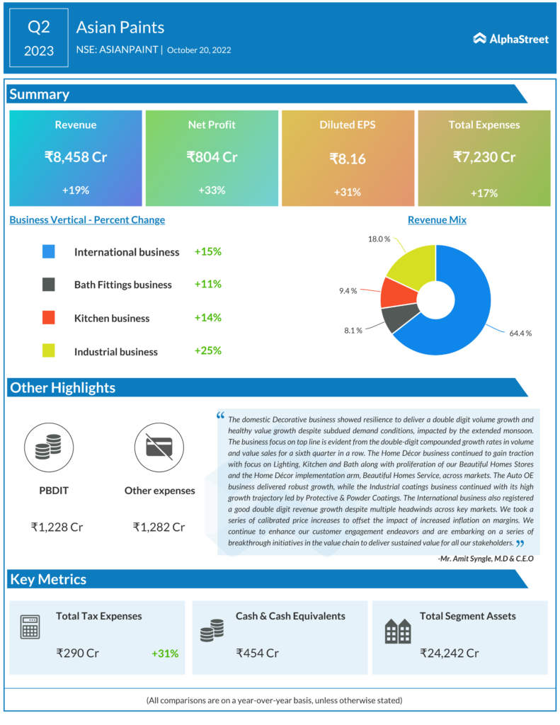 The company reported that the domestic Decorative business showed resilience to deliver a double-digit volume growth and healthy value growth despite subdued demand conditions, impacted by the extended monsoon.