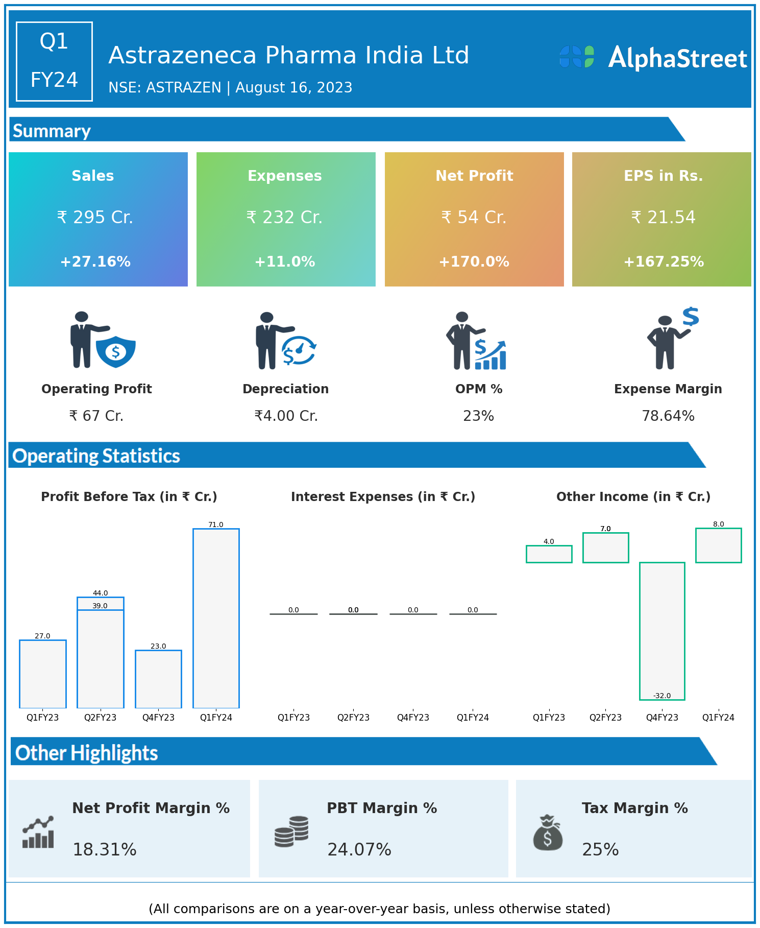 Astrazeneca Pharma India Ltd reported Revenues for Q1FY24 of ₹295.00 Crores up from ₹232.00 Crore year on year, a rise of 27.16%.