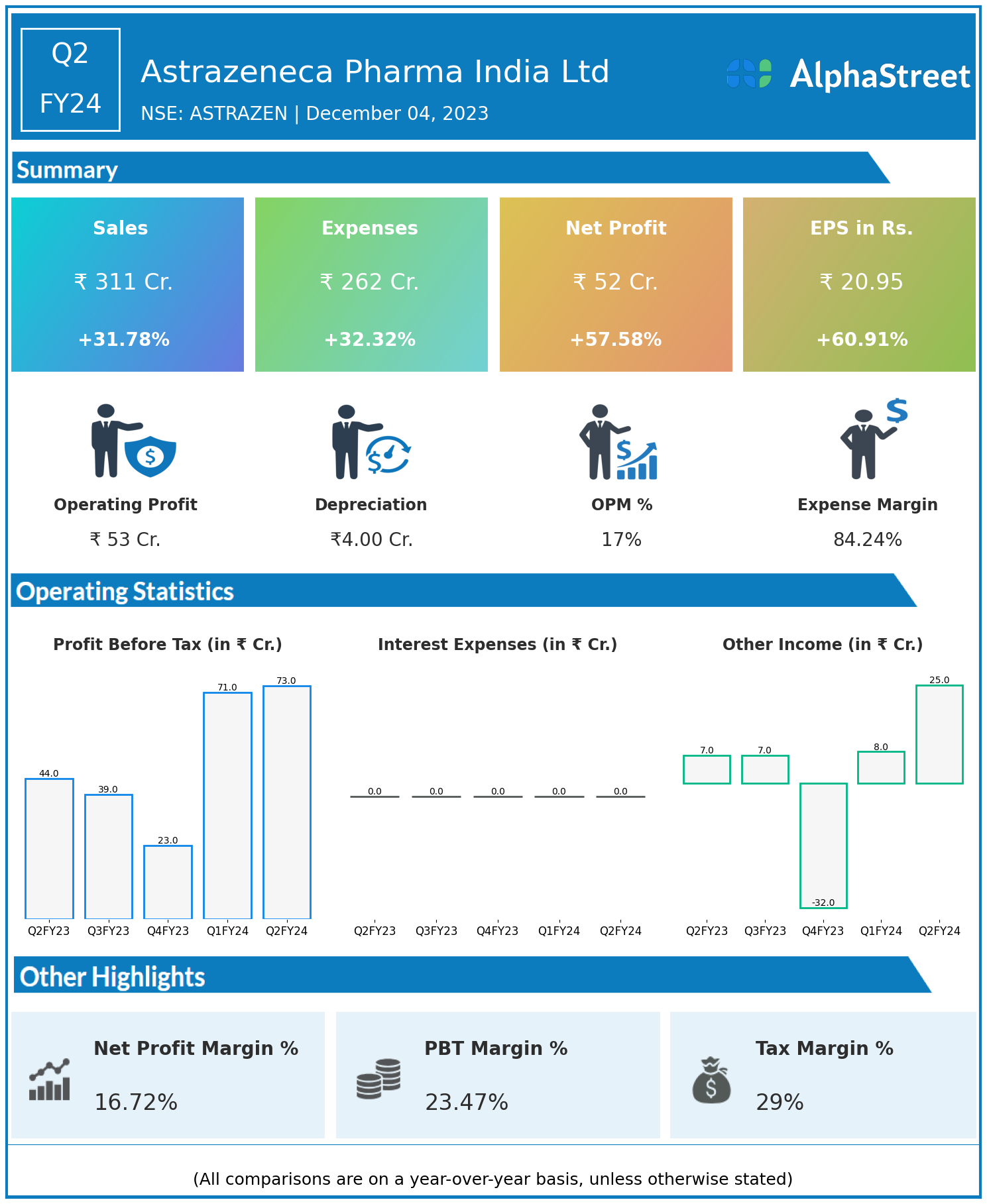 Astrazeneca Pharma India Ltd reported Revenues for Q2FY24 of ₹311.00 Crores up from ₹236.00 Crore year on year, a rise of 31.78%.