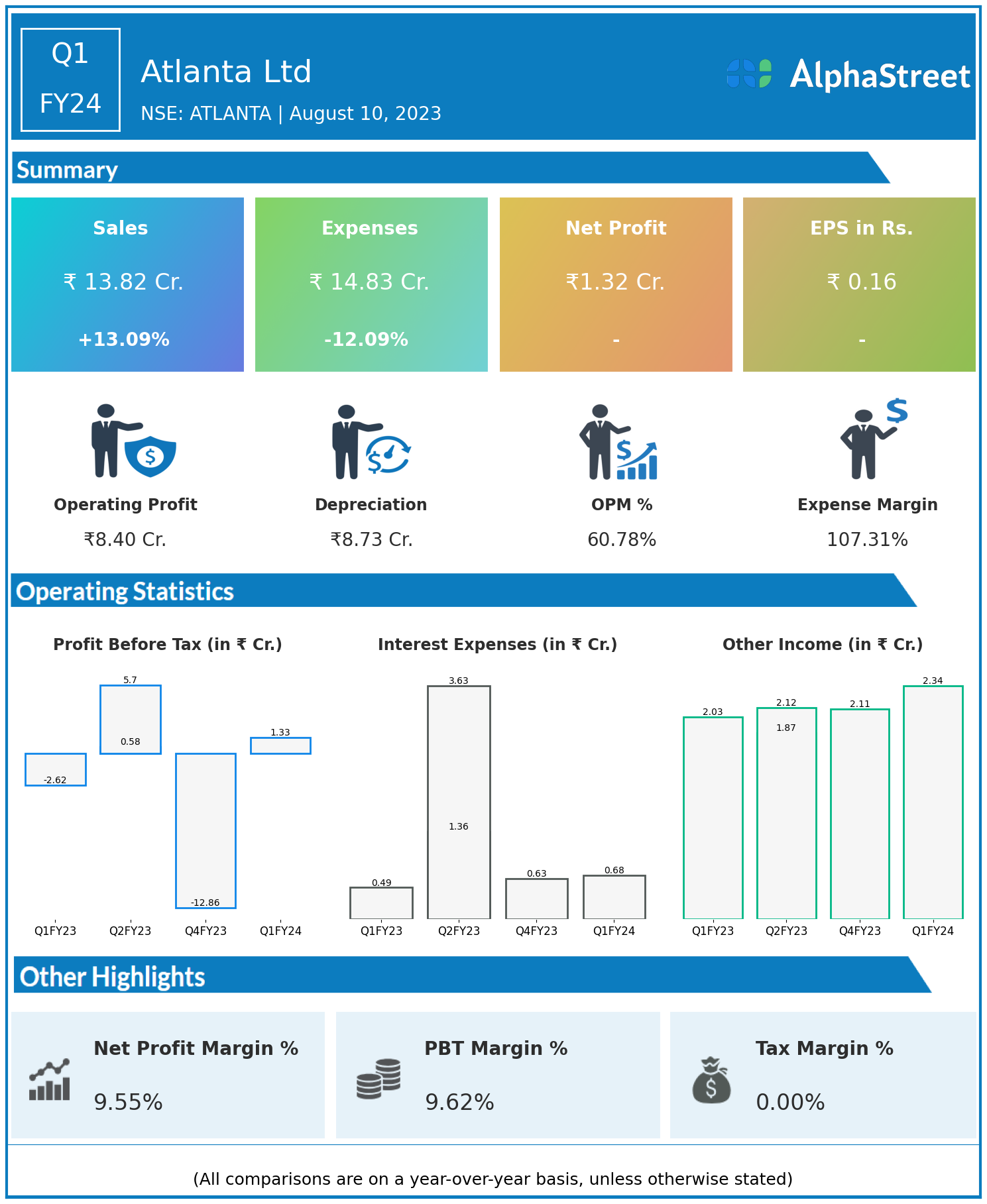 Atlanta Ltd reported Revenues for Q1FY24 of ₹13.82 Crores up from ₹12.22 Crore year on year, a rise of 13.09%.