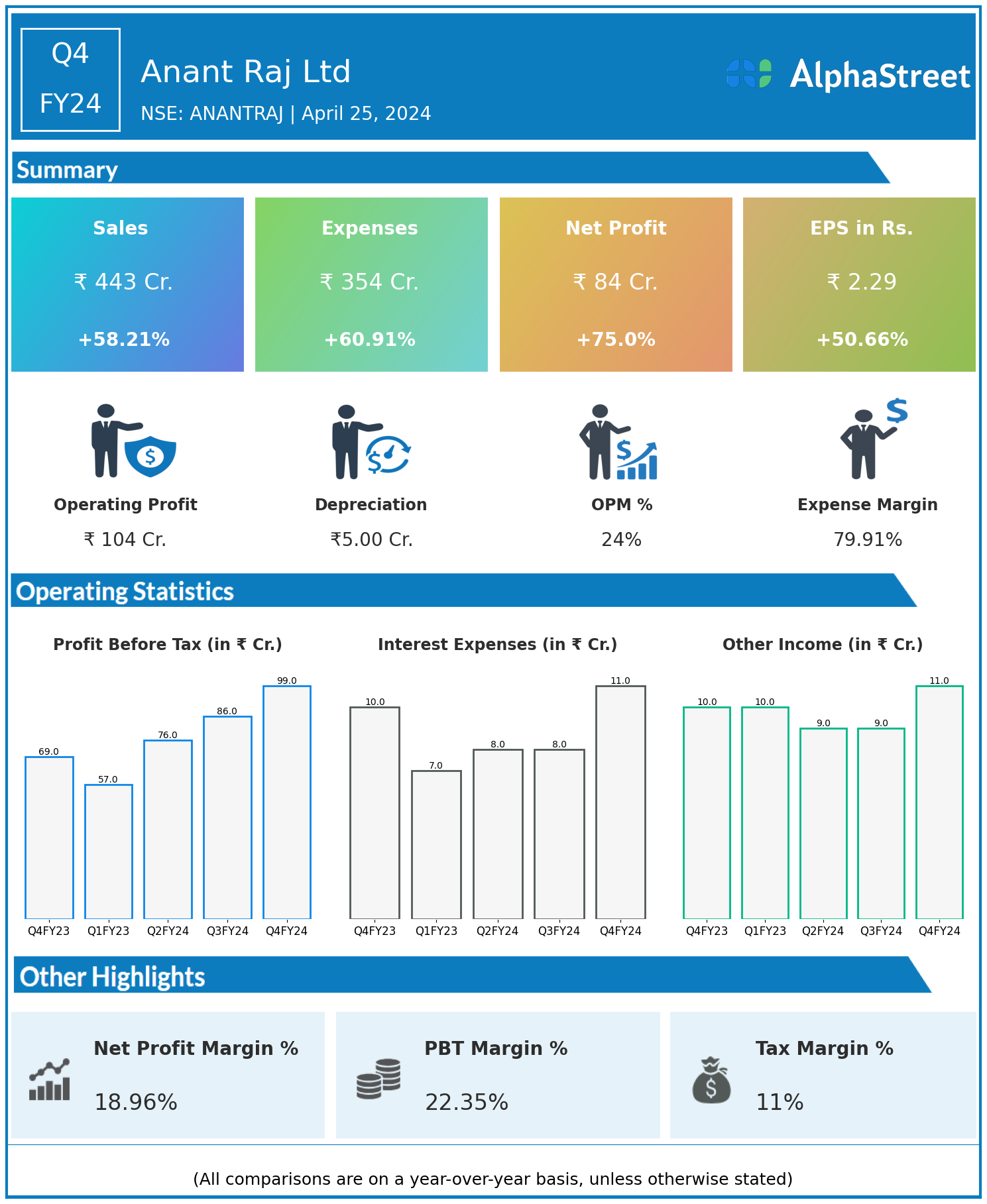 Anant Raj Ltd reported Revenues for Q4FY24 of ₹443.00 Crores up from ₹280.00 Crore year on year, a rise of 58.21%.