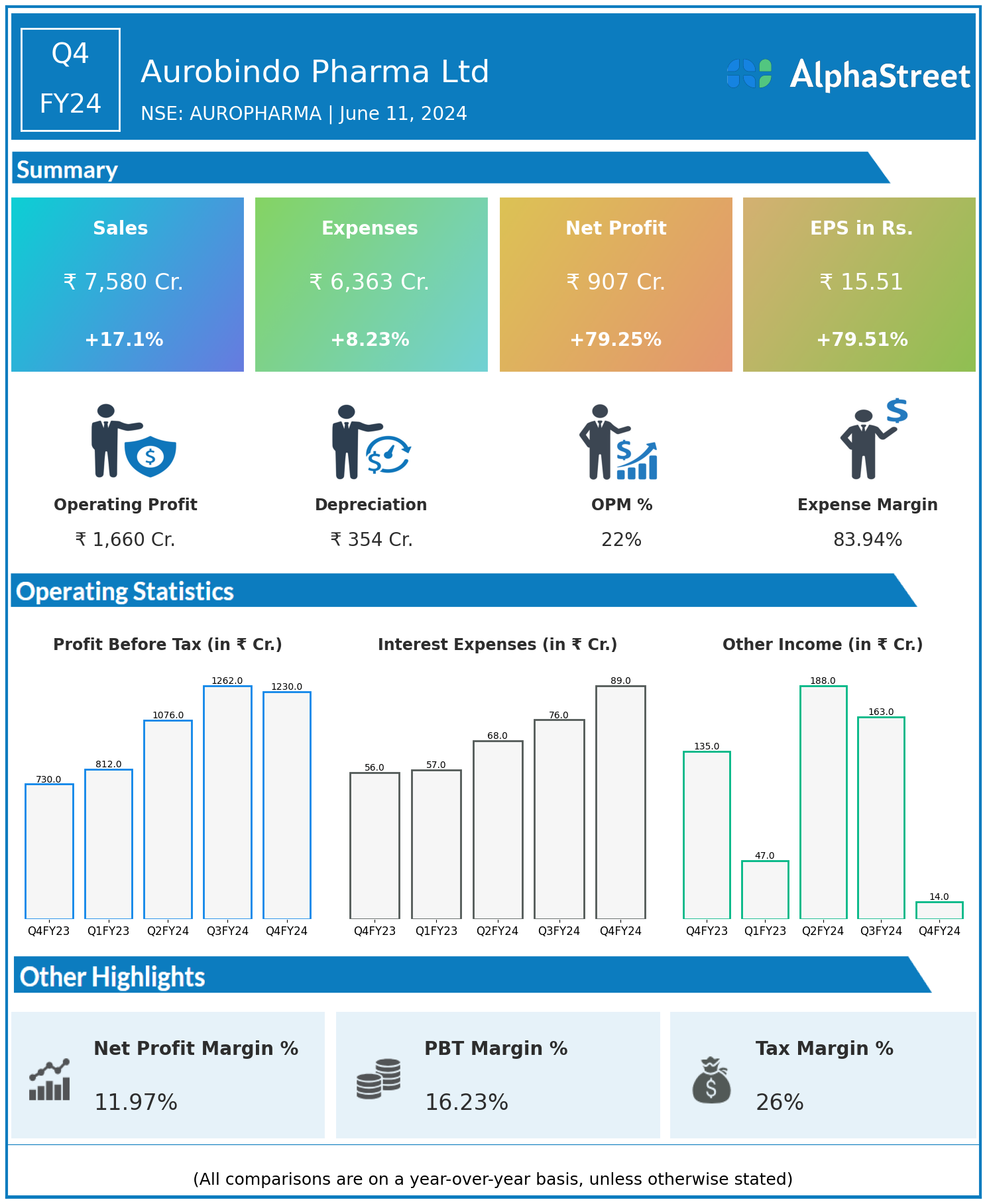 Aurobindo Pharma Ltd reported Revenues for Q4FY24 of ₹7,580.00 Crores up from ₹6,473.00 Crore year on year, a rise of 17.1%.