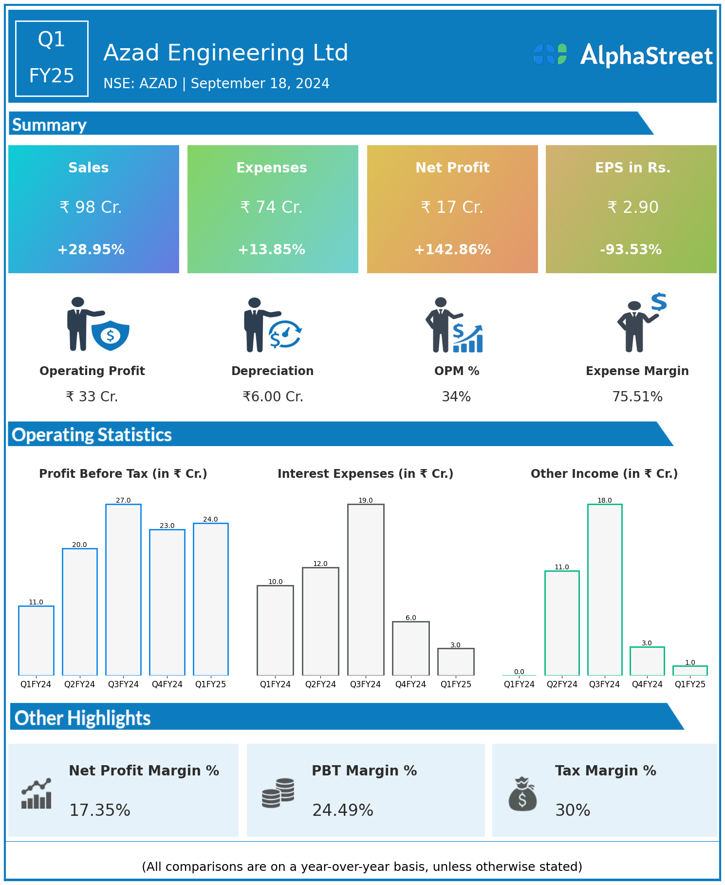 Azad Engineering Ltd reported Revenues for Q1FY25 of ₹98.00 Crores up from ₹76.00 Crore year on year, a rise of 28.95%.