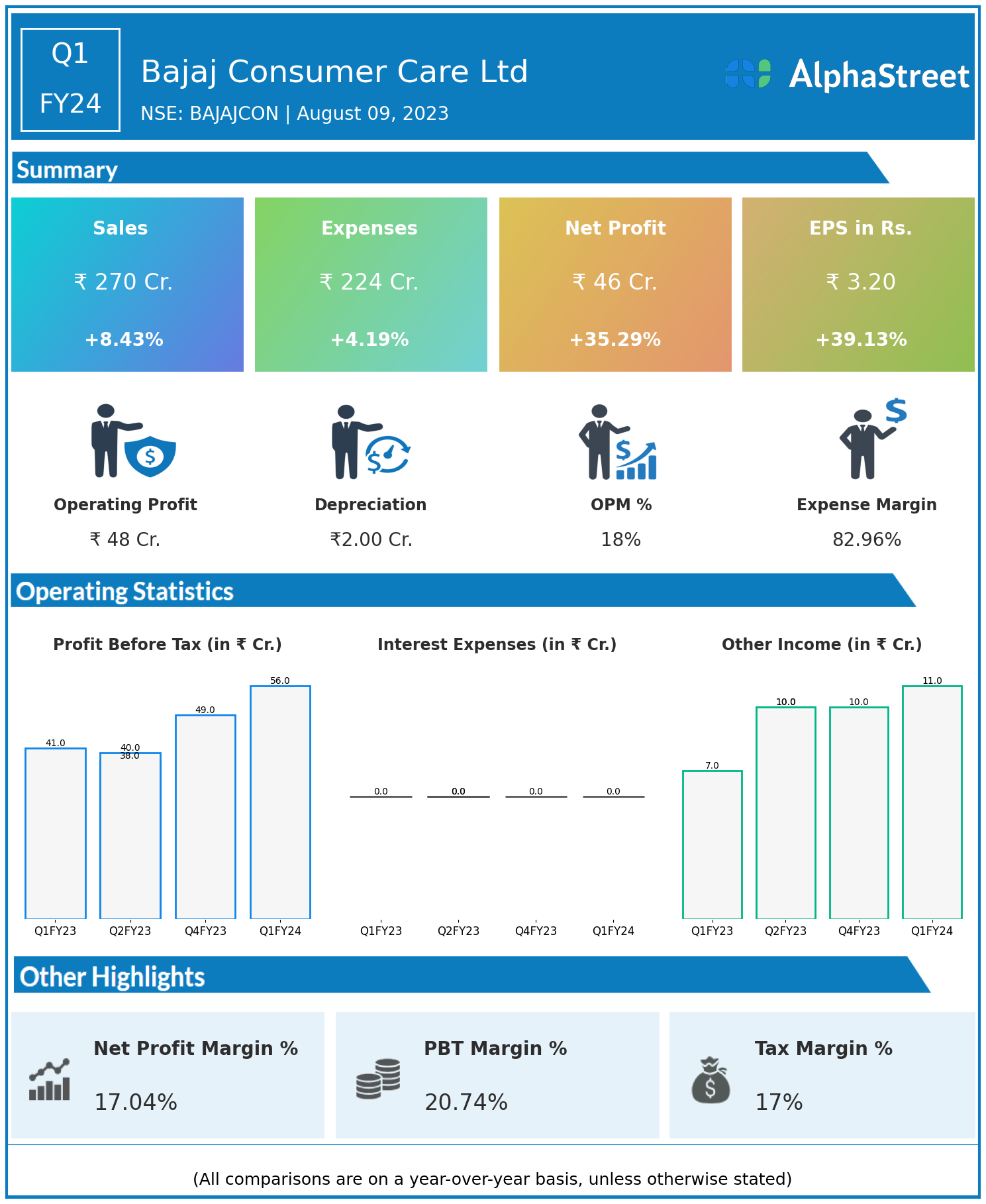 Bajaj Consumer Care Ltd reported Revenues for Q1FY24 of ₹270.00 Crores up from ₹249.00 Crore year on year, a rise of 8.43%.