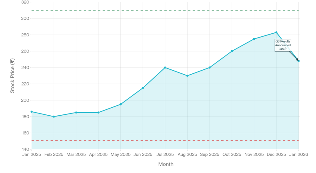 Bajaj Consumer Care’s market capitalization declined to ₹3,232 crore following the 4.56% sell-off on results day, down from approximately ₹3,646 crore at the start of January 2026. The company’s market cap has fluctuated significantly over the past 12 months, ranging from ₹2,400 crore at the 52-week low to approximately ₹4,000 crore at peak valuations in December 2025.