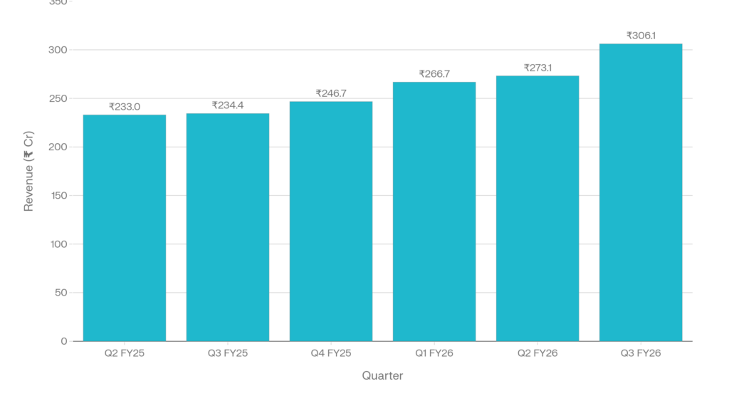 Q3 FY2025-26 delivered record topline performance with revenue from operations reaching ₹306.09 crore, marking the company’s highest quarterly sales ever recorded. The 30.6% year-on-year growth from ₹234.42 crore in Q3 FY25 accelerated significantly above the recent quarterly pace, while quarter-on-quarter growth of 15.1% from Q2’s ₹265.27 crore showed sustained momentum.