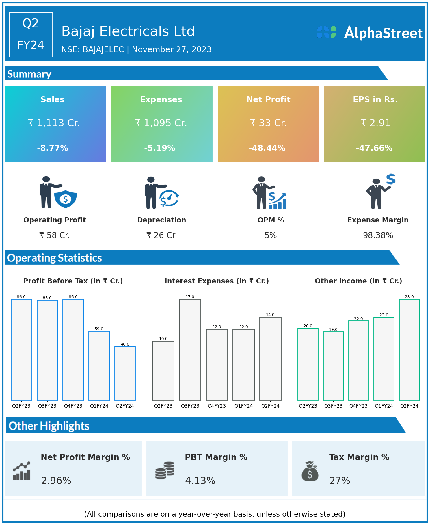 Bajaj Electricals Ltd reported Revenues for Q2FY24 of ₹1,113.00 Crores down from ₹1,220.00 Crore year on year, a fall of 8.77%.