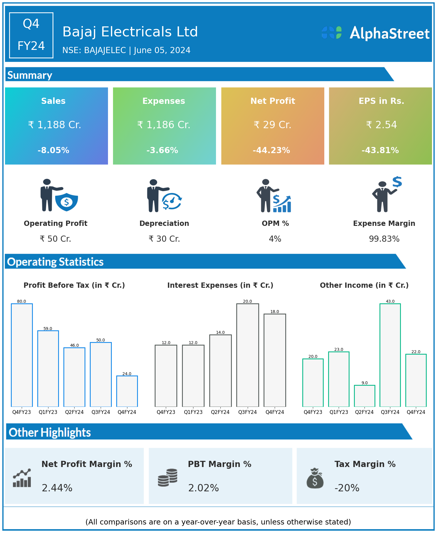 Bajaj Electricals Ltd reported Revenues for Q4FY24 of ₹1,188.00 Crores down from ₹1,292.00 Crore year on year, a fall of 8.05%.