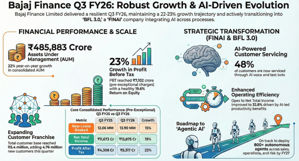 Bajaj Finance Limited (NSE:BAJAJFINSV), a leading Indian non-banking financial company (NBFC) with a deposit-taking license, focused on the mass and affluent customer segments, reported a 23% increase in consolidated core profit before tax to ₹7,102 crore for the third quarter ended December 31, 2025, driven by robust loan disbursements and a rapidly expanding customer franchise.