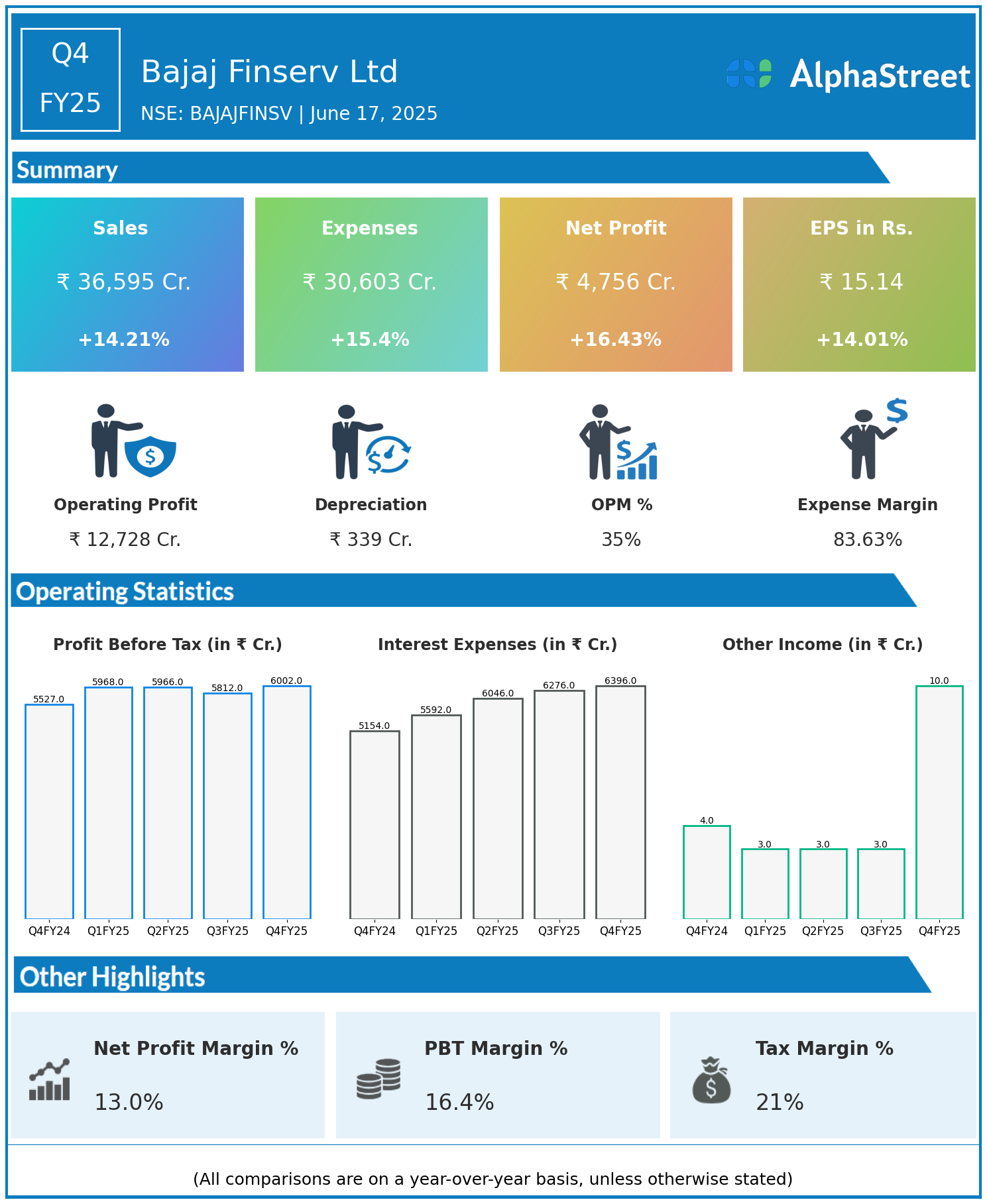 Bajaj Finserv Ltd reported Revenues for Q4FY25 of ₹36,595.00 Crores up from ₹32,041.00 Crore year on year, a rise of 14.21%.