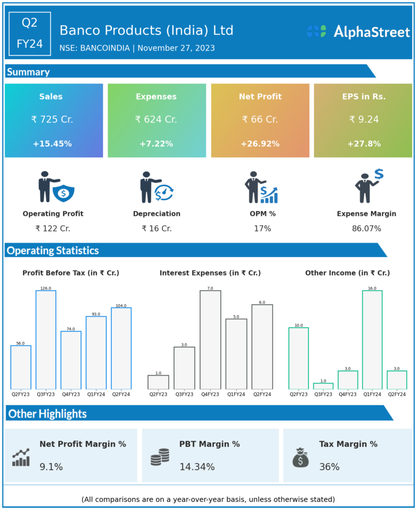 Banco Products (India) Ltd reported Revenues for Q2FY24 of ₹725.00 Crores up from ₹628.00 Crore year on year, a rise of 15.45%.