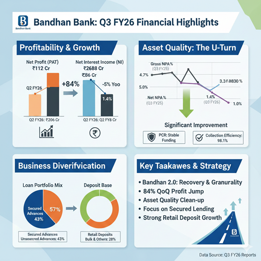 Q3 FY26 highlights Bandhan Bank’s successful transition toward a diversified, secured-lending model. With loans and advances growing 10% YoY to ₹1.45 lakh crore and a significant recovery in profitability, the bank is effectively leveraging digital transformation and disciplined credit management to position itself for sustainable, inclusive growth.