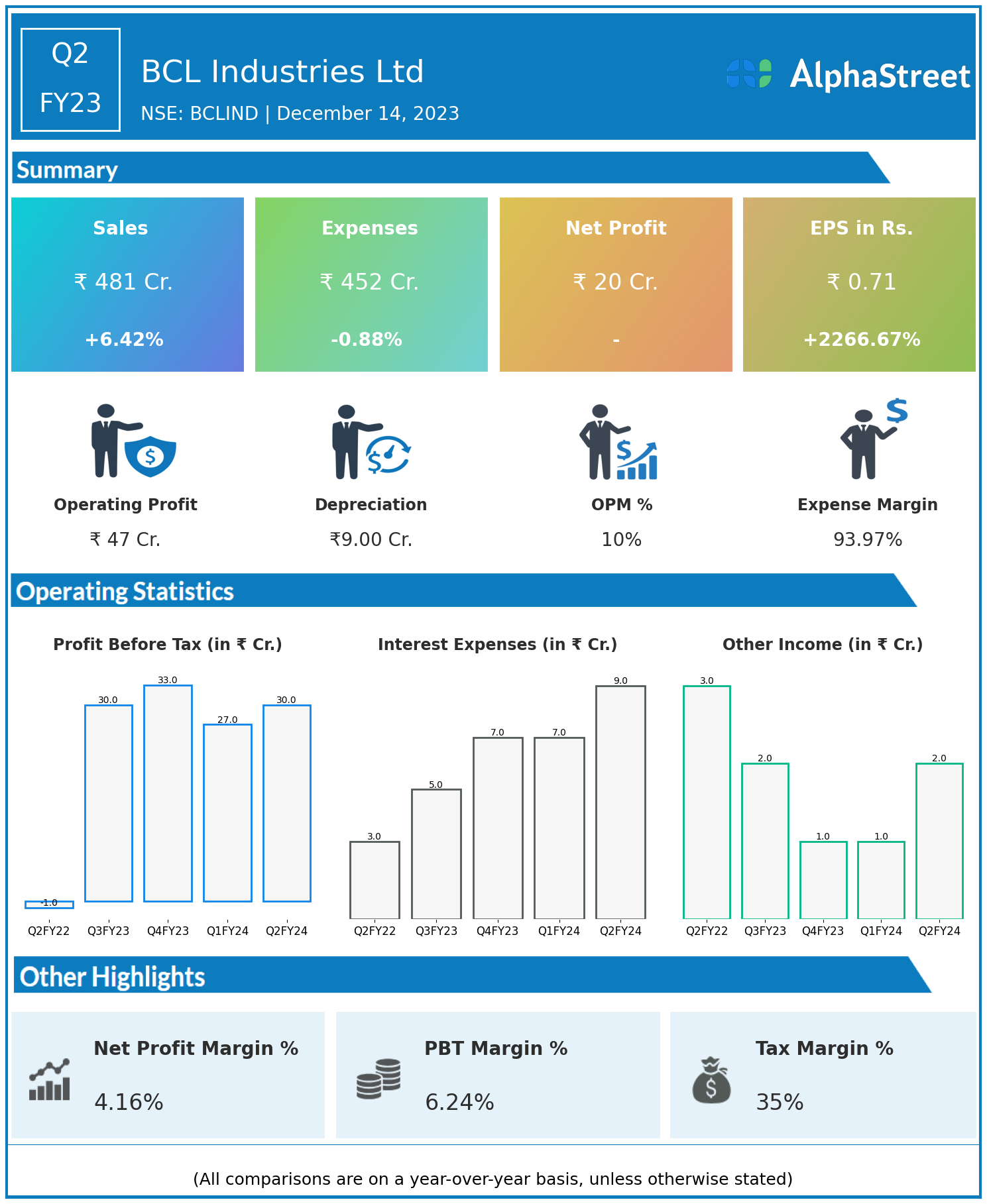 BCL Industries Ltd reported Revenues for Q2FY24 of ₹481.00 Crores up from ₹452.00 Crore year on year, a rise of 6.42%.