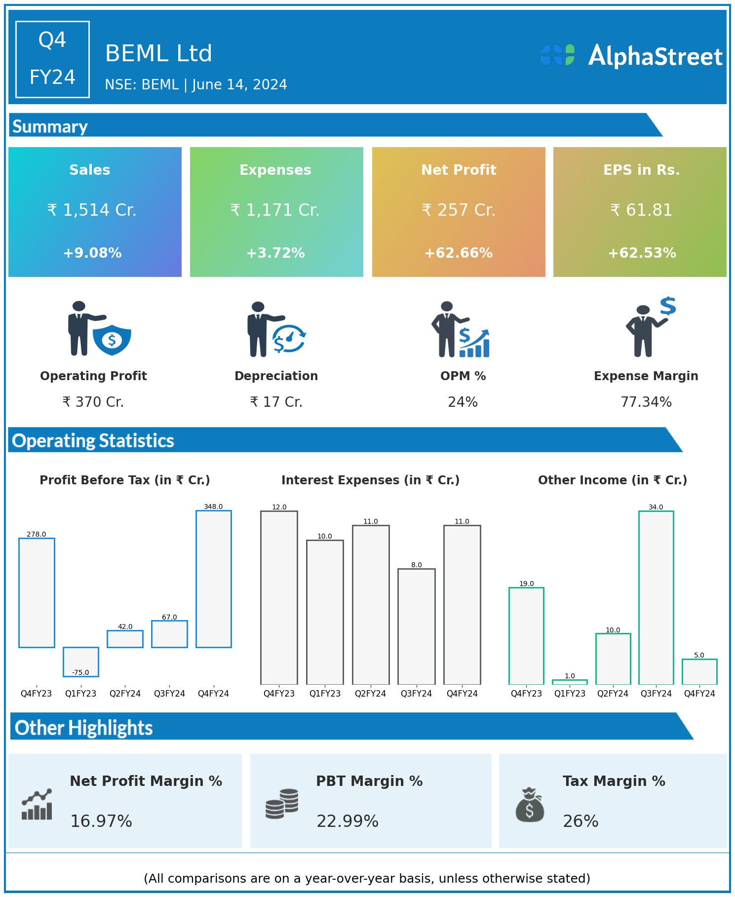 BEML Ltd reported Revenues for Q4FY24 of ₹1,514.00 Crores up from ₹1,388.00 Crore year on year, a rise of 9.08%.