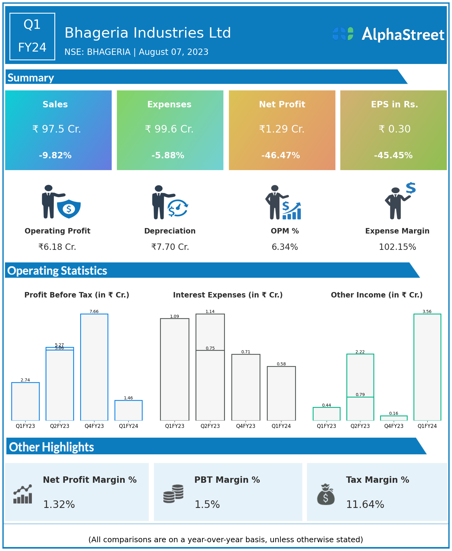 Bhageria Industries Ltd reported Revenues for Q1FY24 of ₹97.50 Crores down from ₹108.12 Crore year on year, a fall of 9.82%.