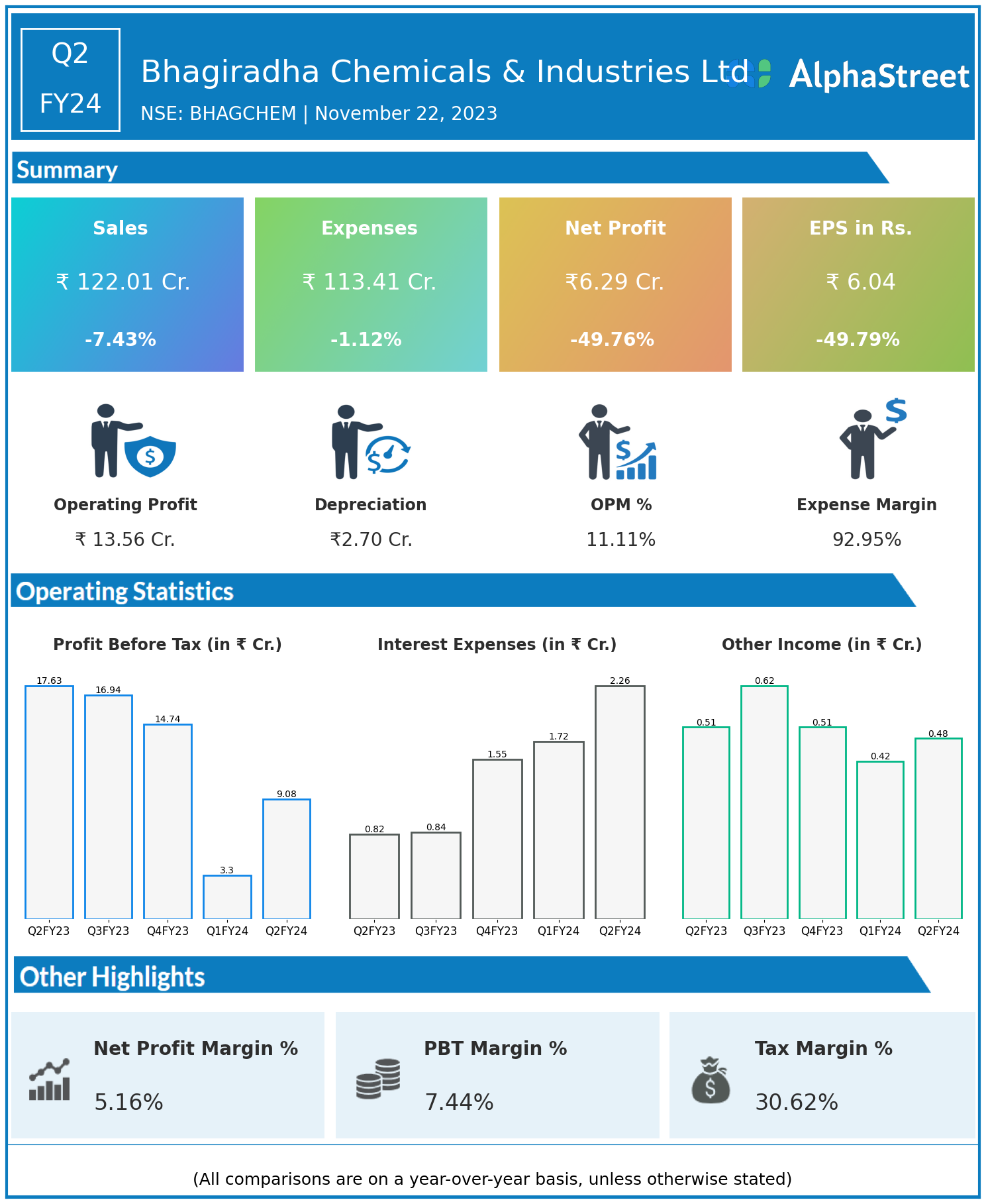 Total Expenses for Q2FY24 of ₹113.41 Crores down from ₹114.69 Crores year on year, a fall of 1.12%.