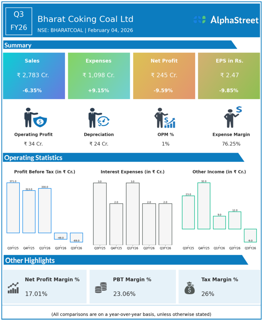 Bharat Coking Coal Ltd swung to a Q3FY26 net loss of ₹22.88 crore from a ₹425 crore profit YoY, despite revenue holding near ₹2,853 crore. Coal production declined 10.7% to 8.90 MT amid operational challenges, marking stark contrast to prior strong performance.