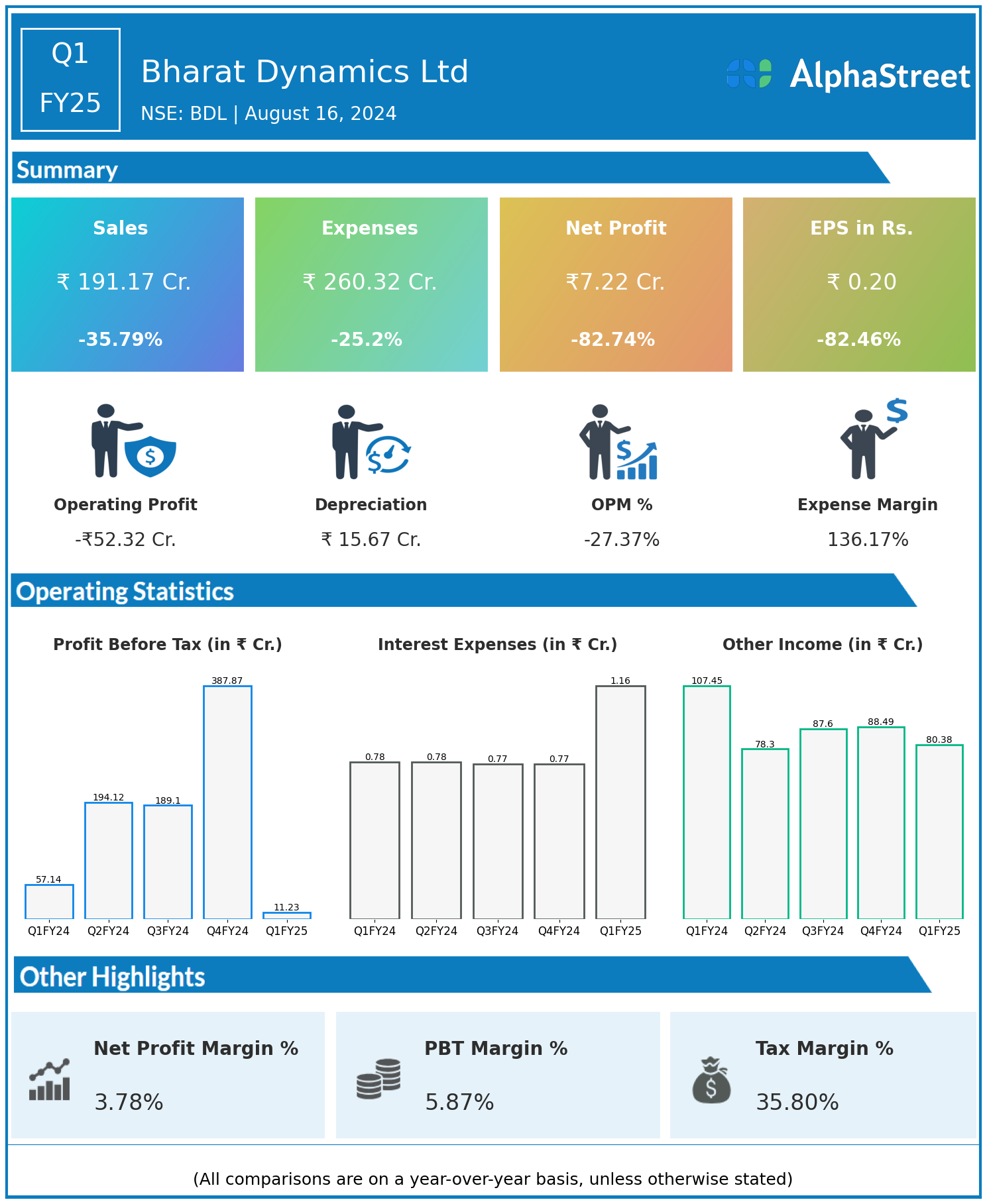 Bharat Dynamics Ltd reported Revenues for Q1FY25 of ₹191.17 Crores down from ₹297.72 Crore year on year, a fall of 35.79%.