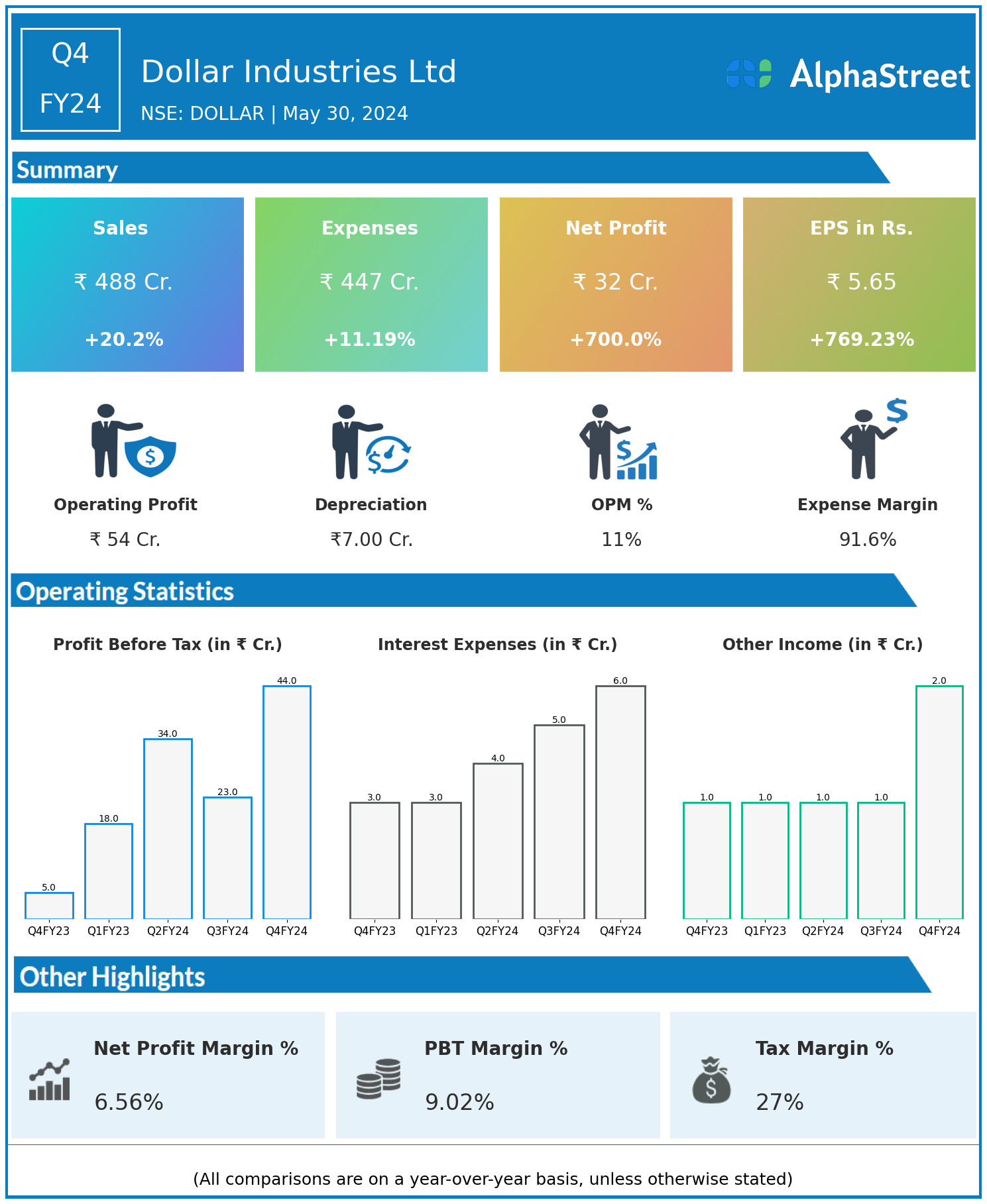 Dollar Industries Ltd reported Revenues for Q4FY24 of ₹488.00 Crores up from ₹406.00 Crore year on year, a rise of 20.2%.