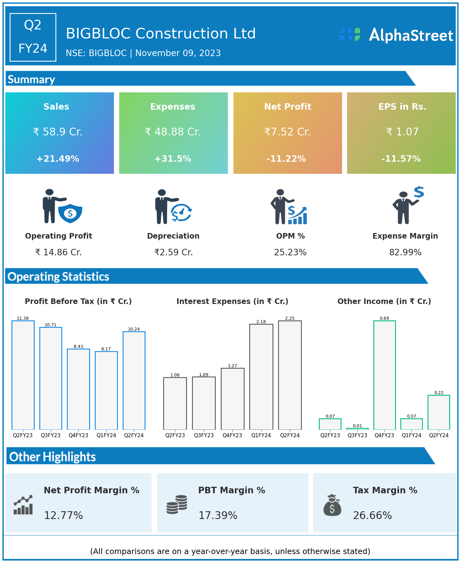 BIGBLOC Construction Ltd reported Revenues for Q2FY24 of ₹58.90 Crores up from ₹48.48 Crore year on year, a rise of 21.49%.